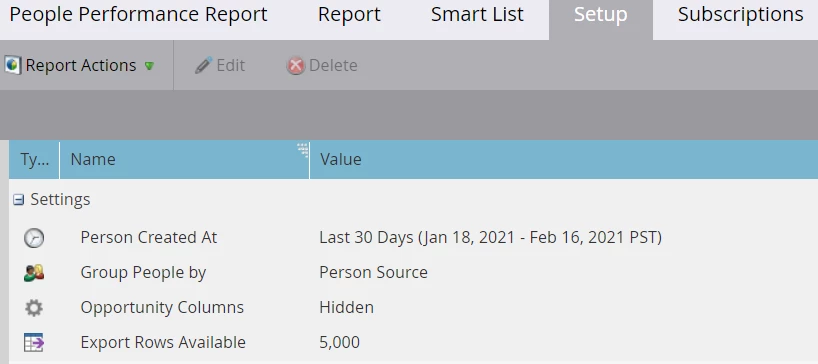 2nd step: - Go to Setup of the report and set created date as well as the grouped by field as Person source like below.