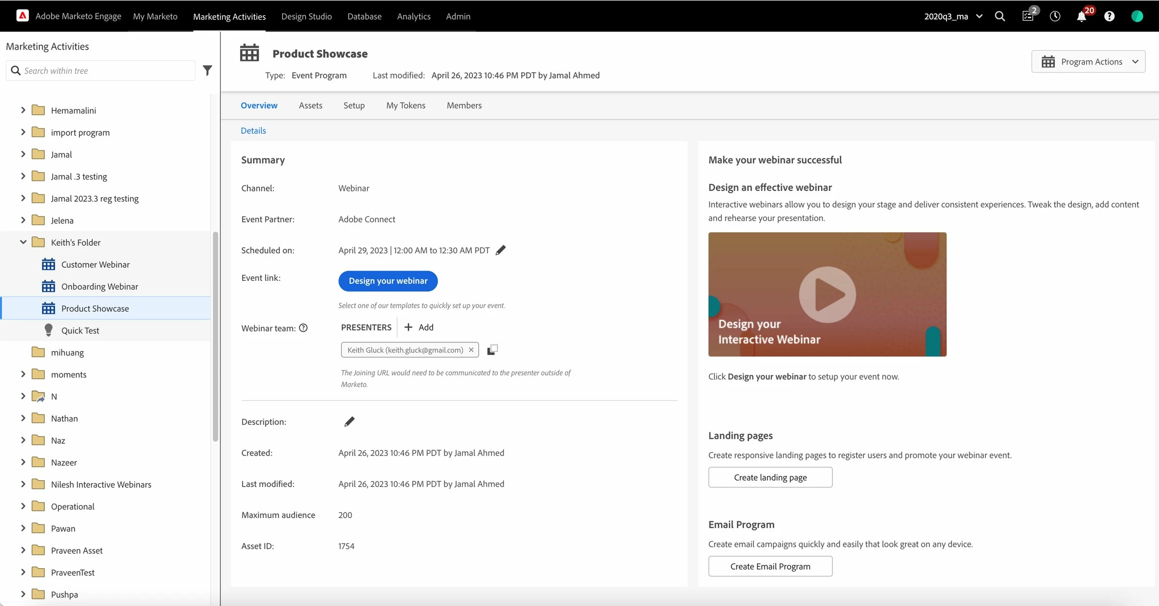 With Interactive Webinars, you can now create, promote, schedule, and deliver webinars right within Adobe Marketo Engage, without needing to purchase a separate webinar platform. You can customize your webinar according to the type of event, add presenters, obtain rich engagement insights through Adobe Connect features such as live polls, chat, Q&A sessions, web link clicks, document downloads, etc., obtain the recording of the webinar right within Marketo Engage, evaluate webinar performance through the rich dashboard and much more.