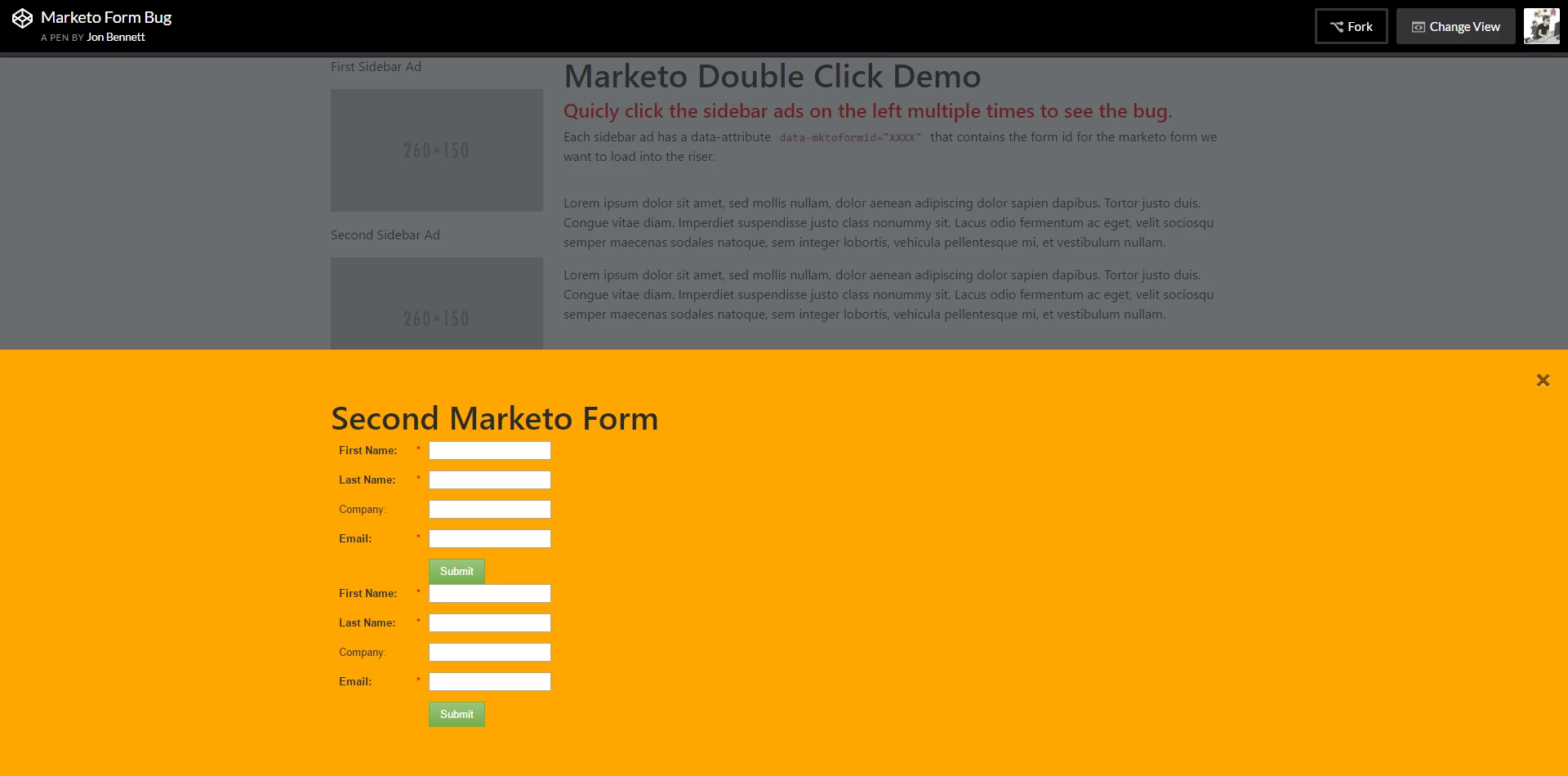 This functionality has worked well for months, until recently when we discovered an issue that if the user rapidly clicks the CTA multiple times, the form children elements (input fields, labels, submit buttons, etc) are getting duplicated. The problem seems to be that if the forms script is aborted before it has a chance to render the form, when executed again it appends the form elements from the previous call to the current form object, causing duplicates of the form's elements to get loaded.