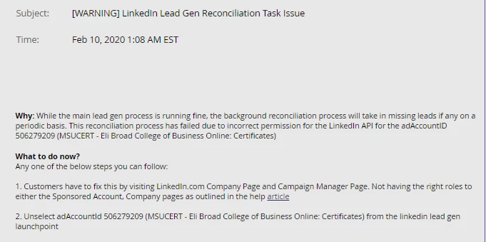 Out of curiosity, is that error message from Marketo or from LinkedIn? I've not seen that specific wording before.