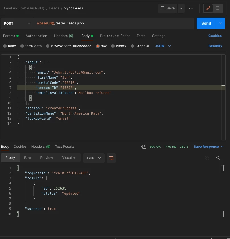 When you send data into Sync Lead, the payload looks like this in a typical use case (when you are not overriding the dedupe field). Ignore the partitionName for now, it has no bearing on this example. So with the Dedupe field overridden to be email + account Id, you might expect you'd use the same payload, including the "lookupField".