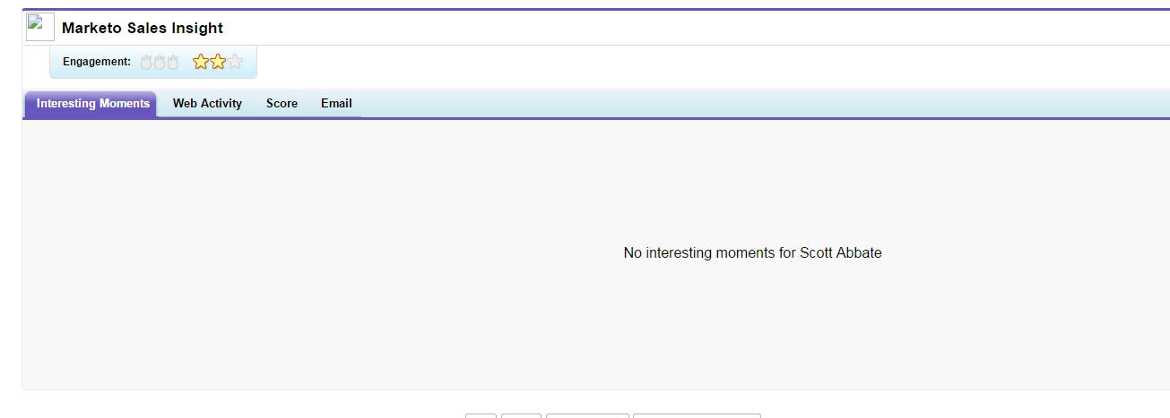 Marketo is not syncing with any lead or contact in SFDC. Interesting Moments, Web Activity, Score and Email are not displaying.