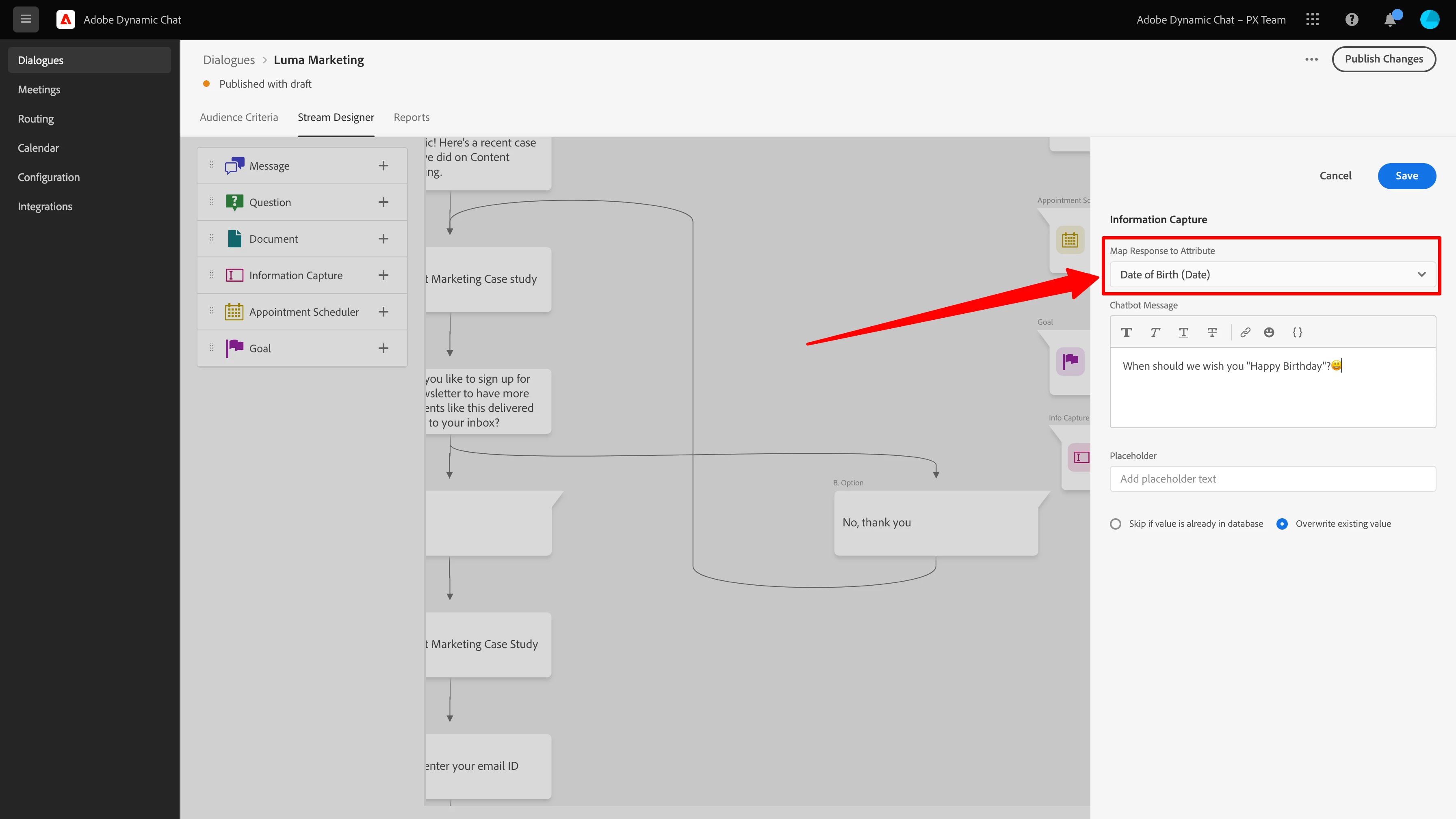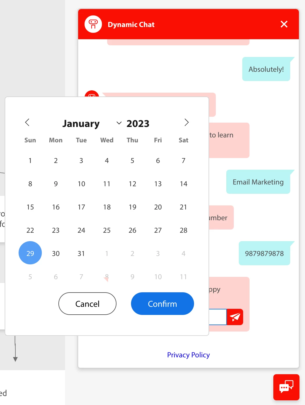 Now Infocapture card also supports Date & Datetime fields. Marketo Integration page, select and sync date or datetime type attributes to make them part of Infocapture card in your dialogue. This also shows a calendar and time picker for the visitor to select the date and time they want to input (You can even see the experience in the preview 😃).