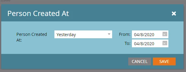 - Go to the "Setup" tab of that new report, and change the "Person Created At" filter to use "Yesterday" as your filter. (Screenshot below)