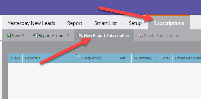 Navigate to "Subscriptions" and click "New Report Subscription"