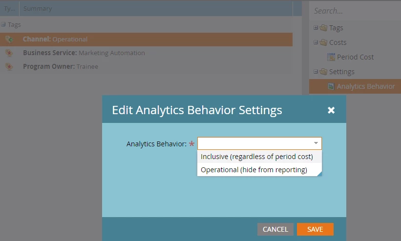 - Adding Period Costs: Period costs allow you to filter on the cost time frame, which is something you can use in the Program Opportunity Analysis Report. If you try to use this filter without setting up your program costs, the program won’t display in your report–even if your Analytics Behavior is set to Inclusive.