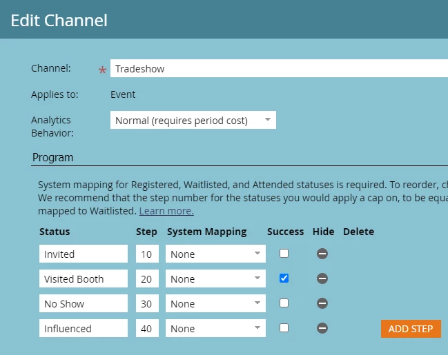 - Use Progression Statuses: While creating Channels, clearly define statuses and success steps based on the program type that would be using that channel. For moving people from one program status to another, use smart campaigns.