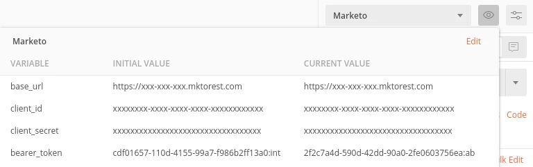 - Ensure that your Marketo environment is selected in the environment dropdown so that the request can access the 3 variables above