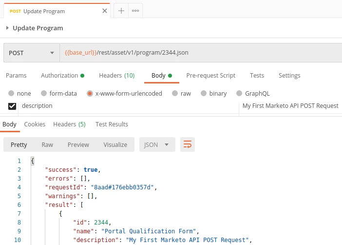 Et Voila! Check the response in the Postman console to see how the description of the program was updated. The skeptics among us can check the description of the program within their instance to see that it has indeed been updated!