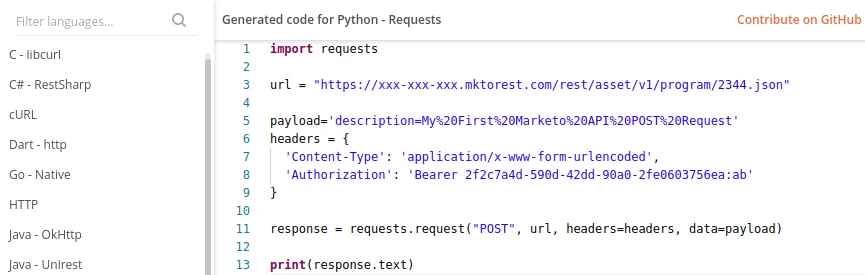 Now that you have the ability to create requests in your programming language of choice you can now embed these requests in scripts to unlock more advanced interaction with leads and assets in Marketo. Alternatively, you can now use these generated code snippets within Zapier to make requests.