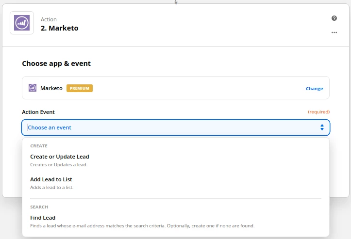 For example, the only trigger available in Zapier for Marketo is the "New Lead" trigger and the only actions available are "Create or Update Lead", "Add Lead to List", and "Find Lead".