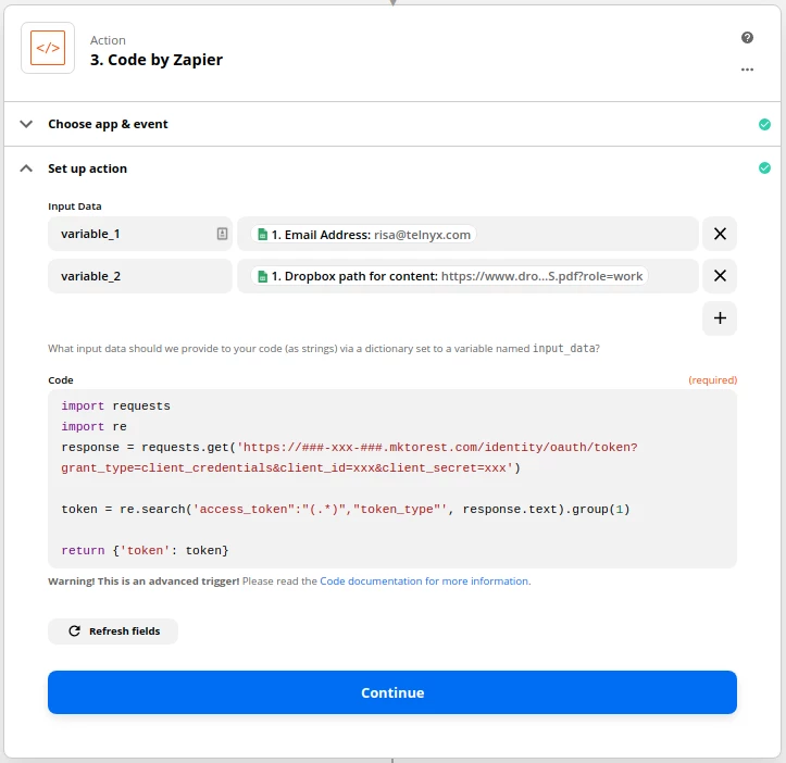 As an aside, there is a Marketo API library for Python that will allow you to make requests very easily, however, if you intend to make requests within Zapier then you will not be able to use this library. Zapier currently uses Python version 3.7 and it does not allow you to import custom libraries. Therefore, you will have to follow the steps above to get the code for the request and then follow the steps below to make the request from within Zapier.