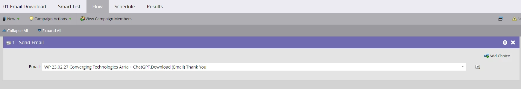 So my Smart List trigger is incredibly simple, if the user clicks on a link containing "/230320_converging_technologies" ON that specific page, they should be added to the campaign and a "Thank You" email should be sent.