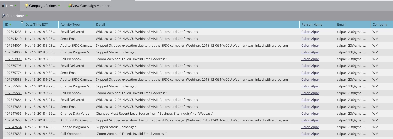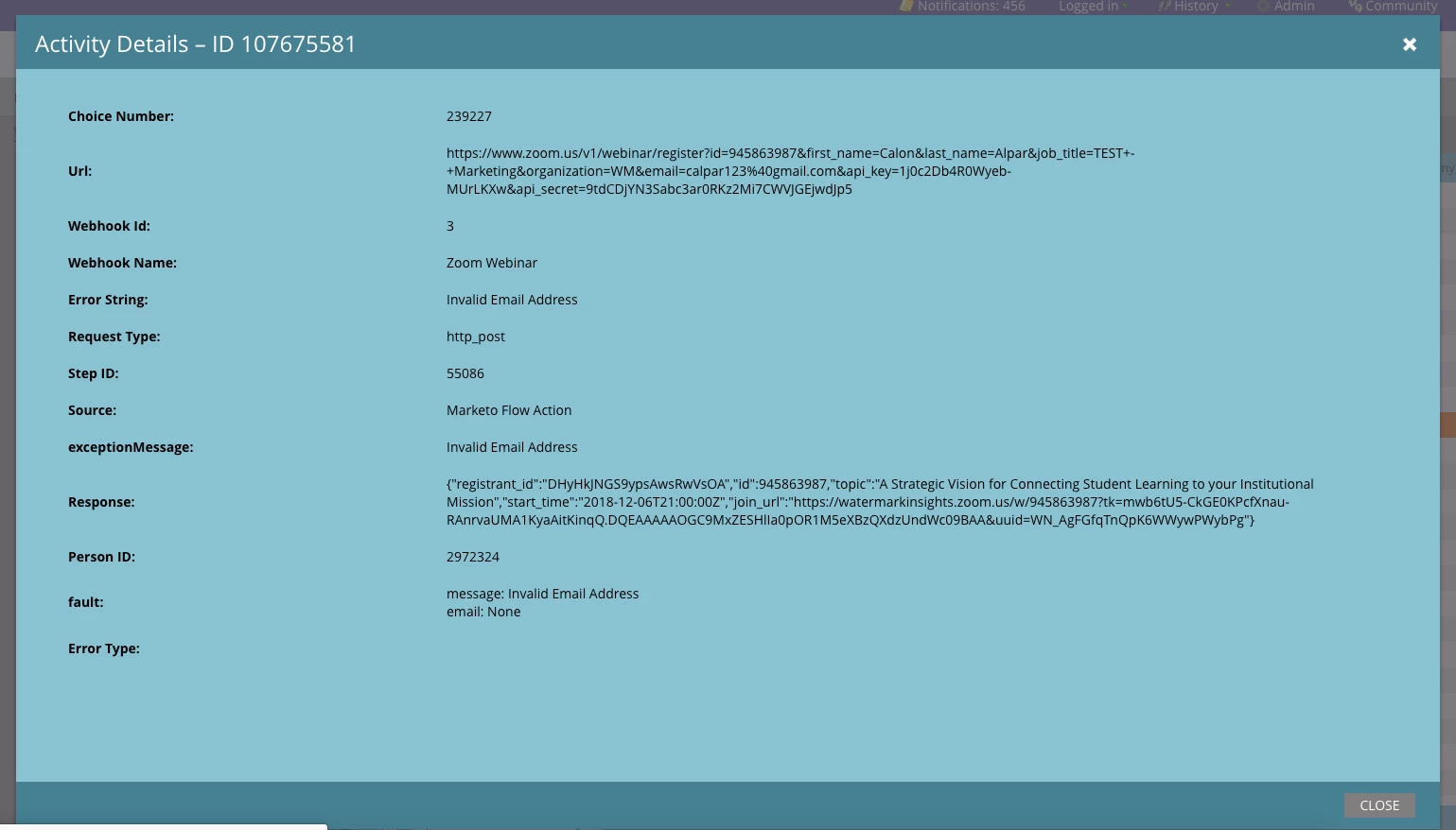 I'm having a major problem that is messing up my operations and I am stumped, even MKTO support hasn't identified an answer and it's been escalated twice. Trying a post here to see if anyone else has any ideas around this. We use Zoom Webinar integration for our webinars and all of a sudden on the registration forms I keep seeing the Invalid Email Address Fail. I have used our normal setup where it has always worked and it's not working. The interesting thing why I don't think the Webhook is broken, is because the registration actually does get processed in ZOOM. The problem is the unique webinar url doesn't get registered in the person's MKTO record.