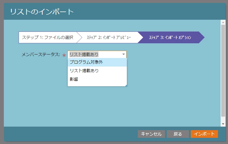 インポートする際に、メンバーステータスで選択したステータスがリード(顧客)に割当てられます。