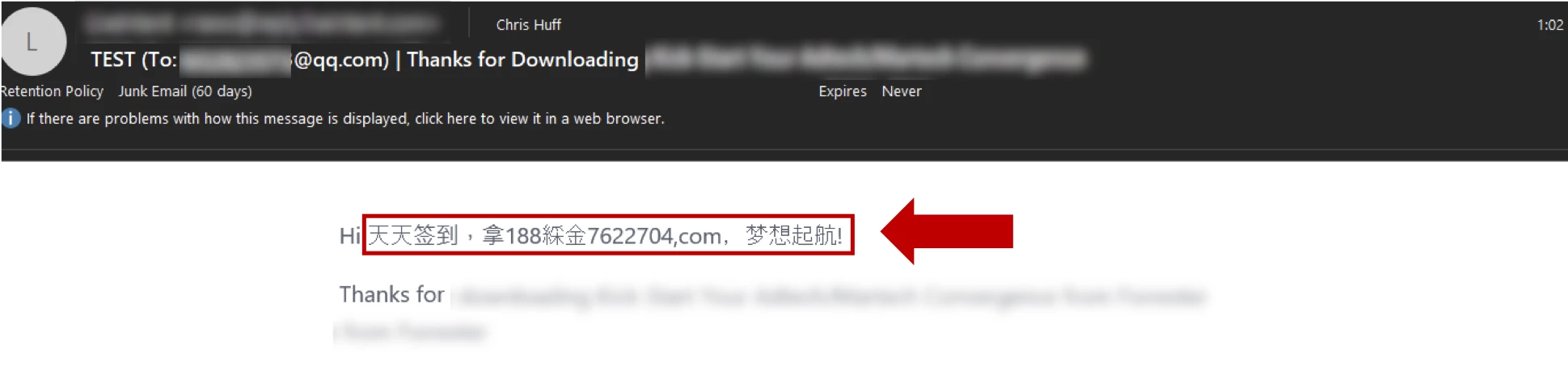 It can be difficult for an ESP or MA, like Marketo, to identify these kinds of attacks when done successfully. The point of the attack is to take advantage of the form and the resulting personalized emails, not to take them down. So these attackers try to prevent overwhelming the form with requests, often posting an address once a minute or hour. This attack is more successful the longer this behavior goes undetected and more email is delivered. The most common pattern I have observed with this attack pattern is that addresses from Chinese ISPs are added to the form and in the field that the email is personalized with is filled with spam content in Chinese, often linking to gambling sites. This can become problematic when a database becomes bloated with these junk leads. The majority of new subscribers are coming from qq.com and other Chinese domains, and if you are not targeting China it can be easy to identify and resolve. If you are targeting China then this becomes more difficult to manage and the influx of junk leads and a form sending spam content can impact a sender's reputation at top Chinese domains reducing delivery rates to impacted domains.