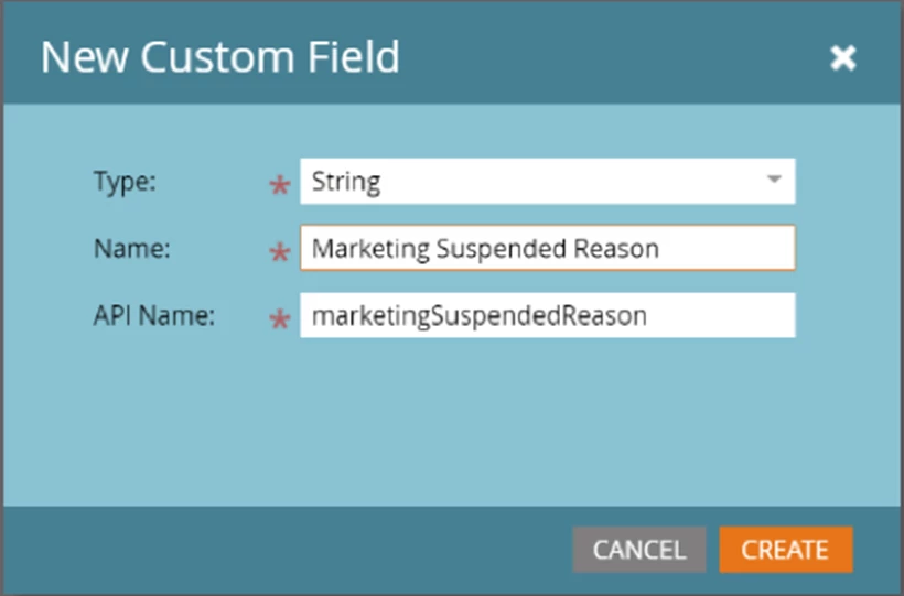 For “Type,” select “String” and for “Name,” enter “Marketing Suspended Reason.” This will automatically fill in the “API Name” field: