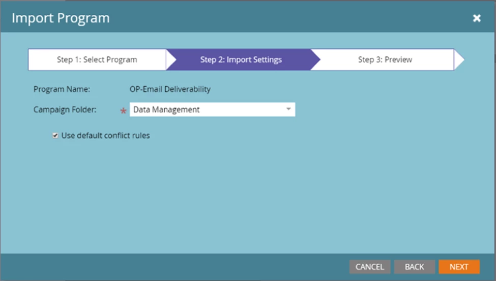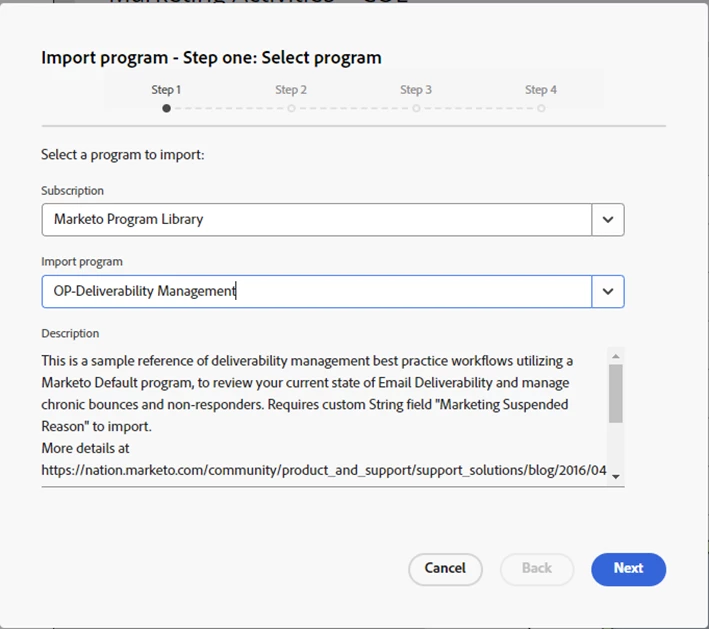 Once your custom field is created, you are ready to import our program. To do so, follow the instructions here. For “Subscription,” pick “Marketo Program Library,” and for “Import Program,” select “OP-Deliverability Management”: