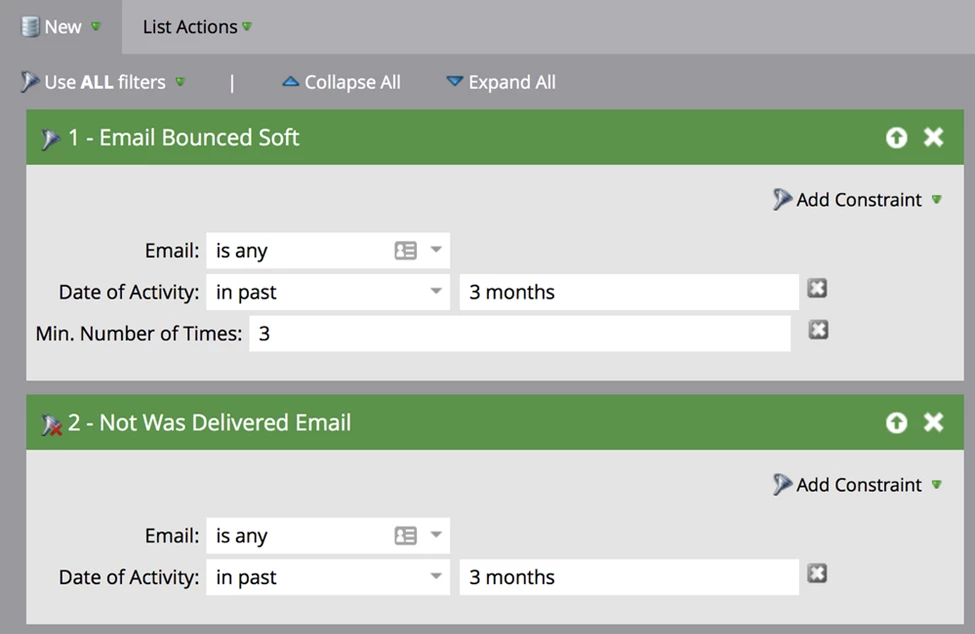- Constraint – Minimum number of times: Three (variable depending on your campaign frequency)