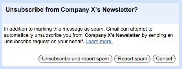 When an email recipient clicks on “Report Spam,” a dialog box will appear that asks if they want to unsubscribe or report the email as spam. If they click unsubscribe, a notification will be delivered to the email address in the List Unsubscribe Header to stop mailing you.