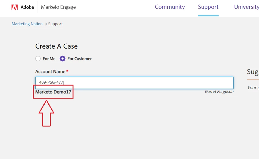 - Navigate to the Create a Case tab of the support portal and select “For Customer” on the “Case Is” section. From there, input the customer’s munchkin ID into the dialog box.