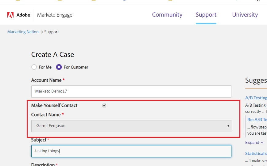 If you are just opening the ticket for your customer, but they should be the primary point of contact with Marketo Support, leave the checkbox blank and select from the list of Authorized Support Contacts the customer has.