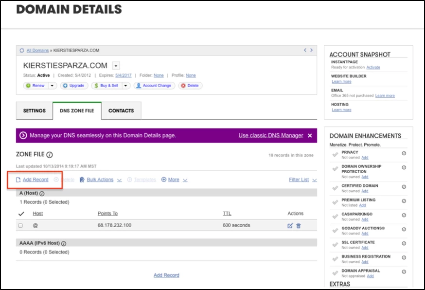 Once you are in the management page for the domain you chose Add Record, see image below.