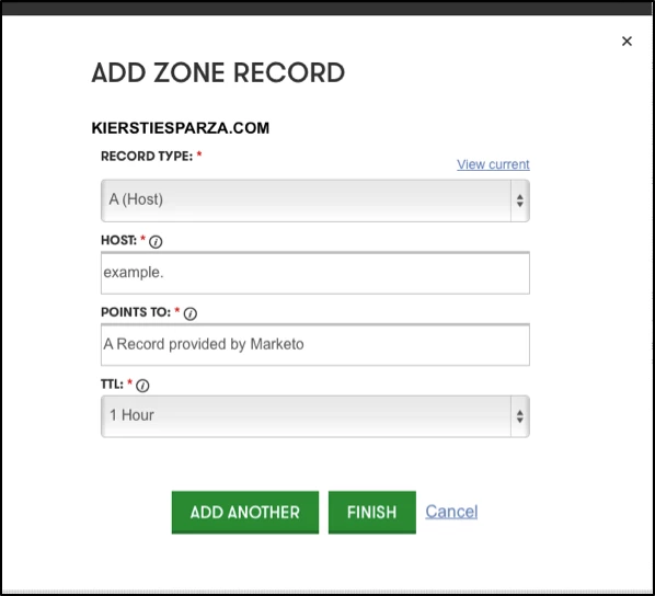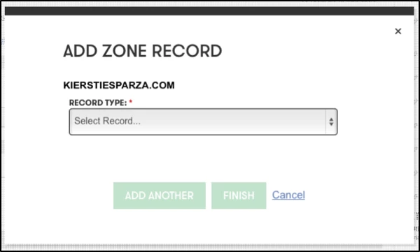 In the example below I am setting up a subdomain for KIERSTIESPARZA.COM. I am setting up example.kierstiesparza.com.