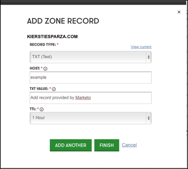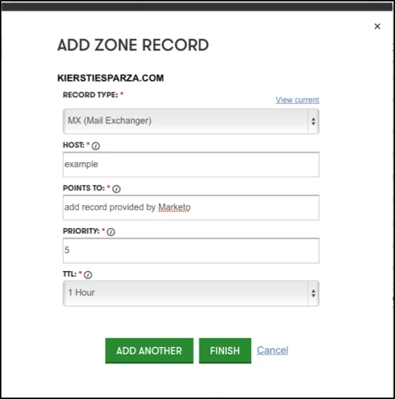 In the HOST: section I enter “example” for the subdomain. The Points To: record will be provided by Marketo Privacy/Delivery Team. Priority can be set to 5.
