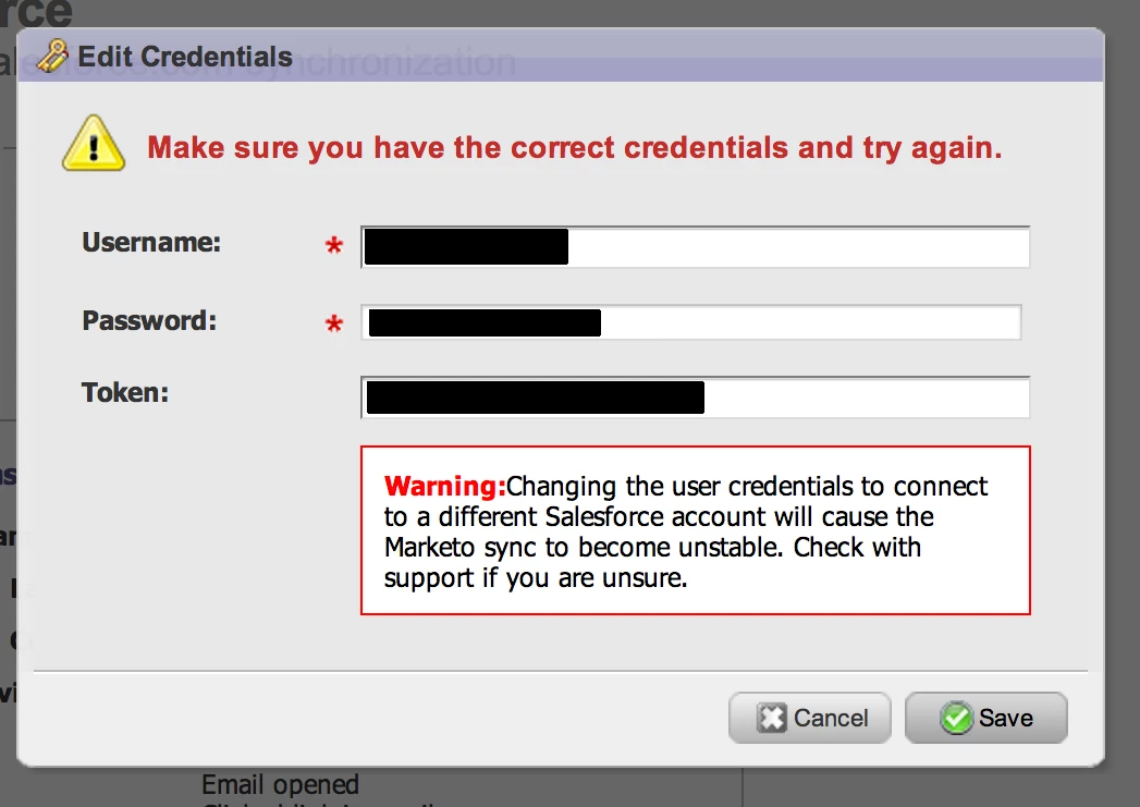 The best way to resolve any issues you may be having with entering your SFDC credentials in Marketo is to follow the instructions below. Nine times out of ten this will resolve the issue, but only if you follow them exactly! Also, be aware that if you're entering new credentials they should be for a user in the same instance of SFDC as the old sync user. It's not currently possible to connect your Marketo instance to a second SFDC instance, and trying to enter credentials from a second instance will result in errors and possible trouble for your Marketo instance.