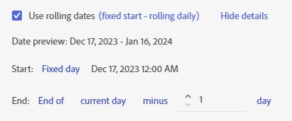 For current events that do not have foreseeable end dates or are still ongoing, you can set a rolling date that updates the date range to end on the current date (or the day before if you want to report on full days).