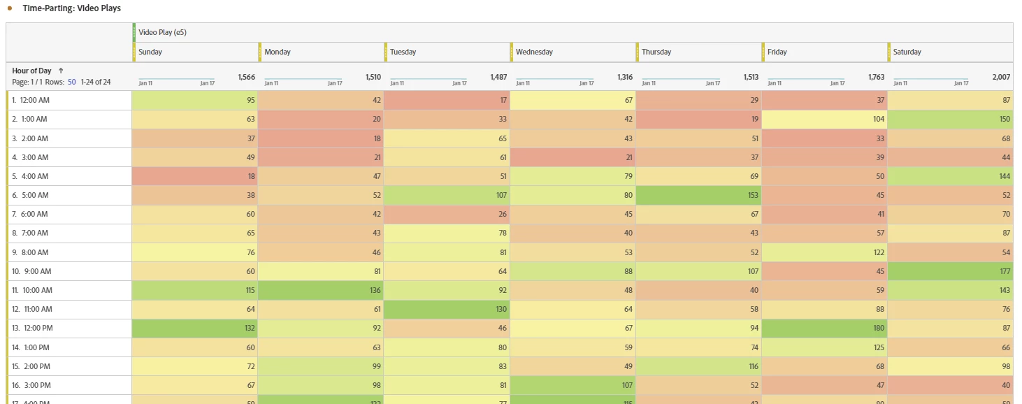 Time-parting heatmaps are a great way to quickly see when visitors are coming to your site/app and consuming your content.