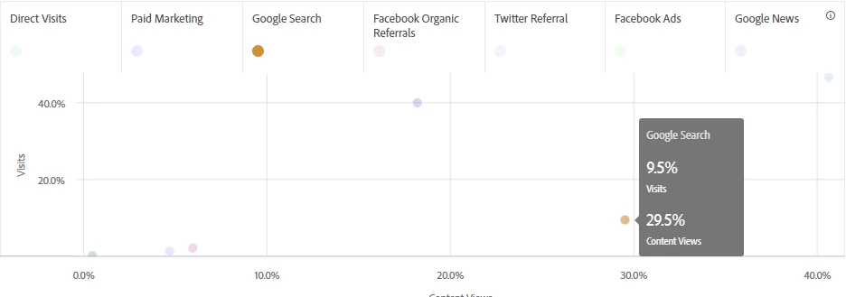 If the newsroom has limited resources, they may want to focus on search optimization efforts. That segment may only account for 10% of visits but almost 30% of content views, which may mean that search is effective in converting referrals to consume content.