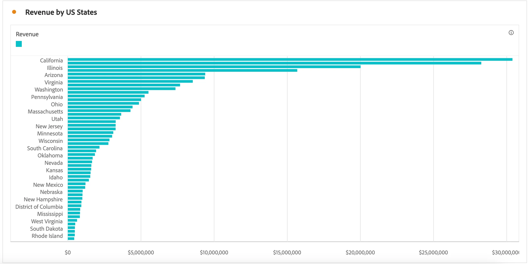 Displaying your organization's key metrics on a map is crucial if the problem or use case you are investigating relates to location. For instance, to identify the average revenue by state, you may begin your analysis with a horizontal bar chart, as shown below: