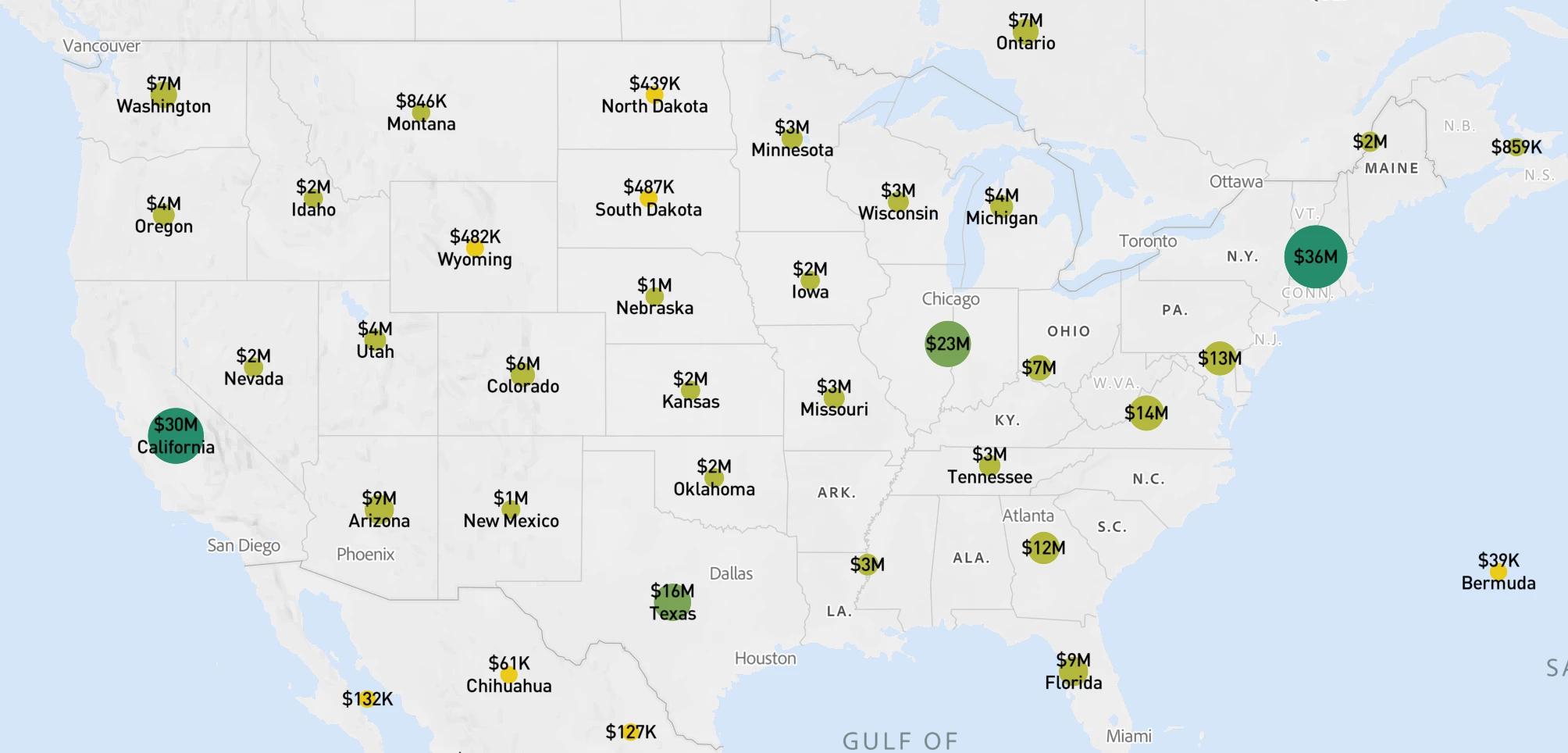 However, a list of states could be more insightful and easier to interpret. As a result, leverage the Map visualization to determine which states drive the highest and lowest revenue. Map symbols can be beneficial to identify the five top or bottom states efficiently. As shown on the map visualization below, bubble size and color represent the amount of revenue by state.