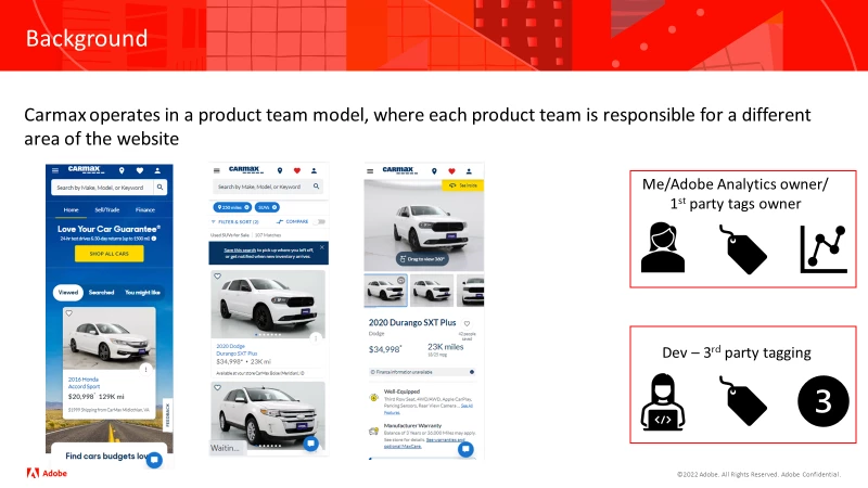 CarMax operates in a product team model, where each product team is responsible for a different area of the website. I provided the 1st party tagging requirements, and was responsible for all the administrative areas in Adobe, but each of those teams used their own developers to implement tags. Then we had another siloed 3rd party tag developer.