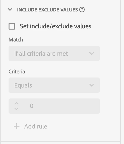 6. Scroll down to select "Set include/exclude values" on the right-hand side and enter the logic of the Derived Metric. In this case, we will set the logic as "Revenue is greater than or equal to $50."