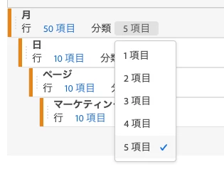 例えば、「行:10 項目」と「分類:5 項目」を設定した場合、レポートの結果では上位 5 項目のみがブレイクダウンされます。その場合には、レポートを生成した後に下位の 5 つの項目に対しても手動でブレイクダウンを追加することで、10 個の項目すべてがブレイクダウンされた結果を確認できます。もし次のページにもレポートが存在する場合は、10項目、つまり手動で設定したブレイクダウンの数が次のページにも反映されるので、次のページで再度設定する必要はありません。