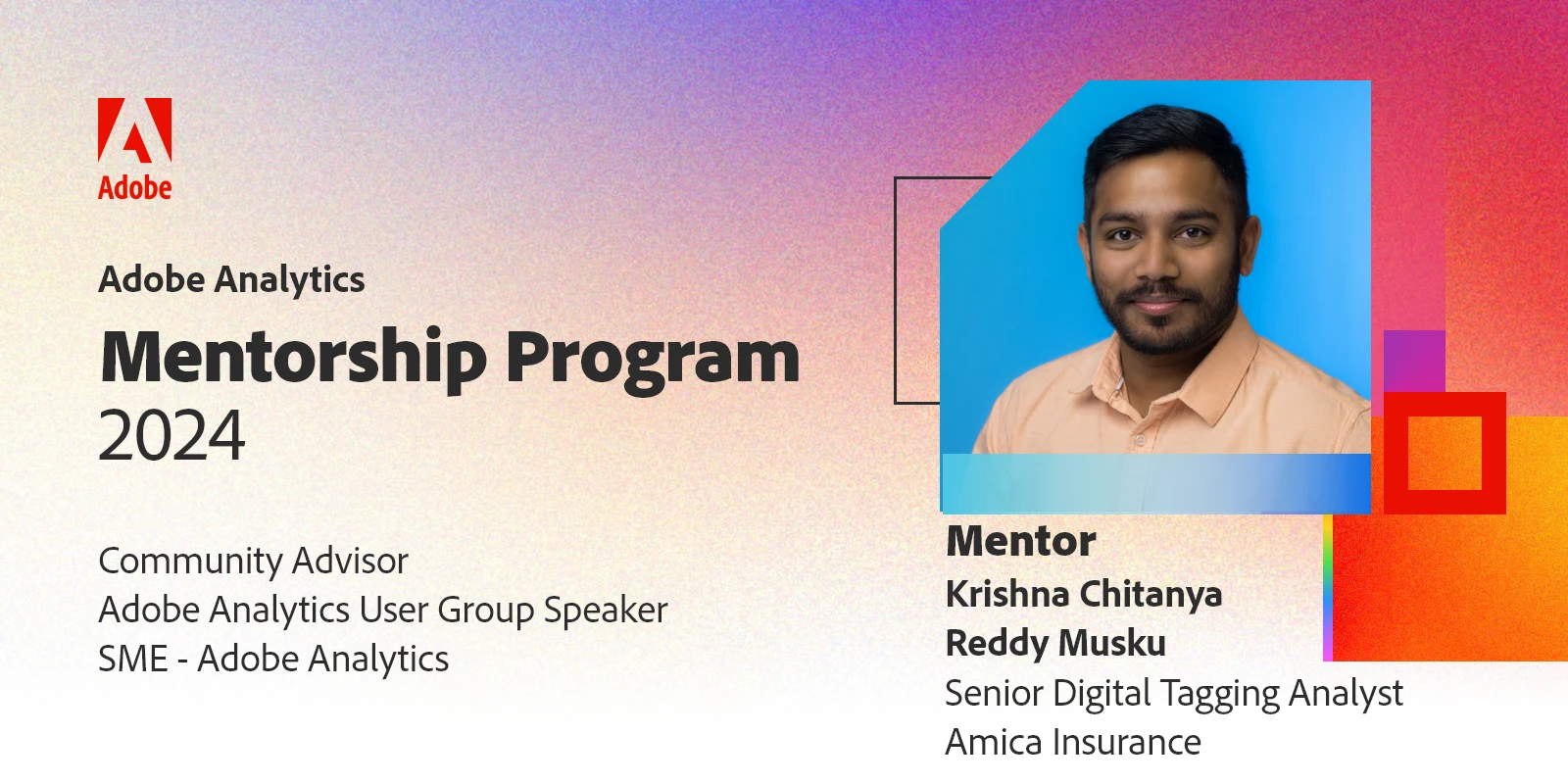 Welcome to the Adobe Analytics Community Mentorship Program 2024! This is the featured Community Discussion thread for your Adobe Analytics Community Mentor, Krishna Chitanya Reddy Musku (aka @Krishna_Musku), who will be here to guide and support you and your peers with your Adobe Analytics questions as you prepare for the Adobe Analytics Business Practitioner Professional Certification (Exam ID: AD0-E212)through to the end of the program.