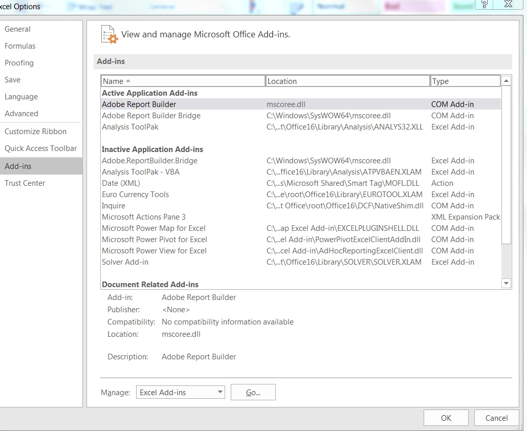 Been using report builder fine for years, opened excel one day and report builder add-in tab is missing. Try usual approach of going options > add-ins and checking if it is disabled, but it says its active, however its definitely not loading at start up. I've tried uninstalling and reinstalling RB to no avail.
