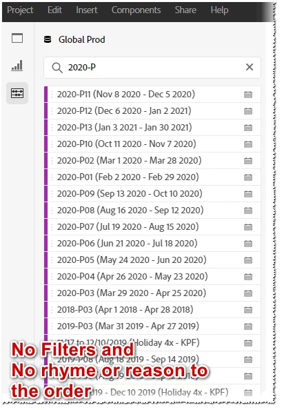 Something that's always annoyed me is when I'm searching for available components. I do not particularly care for the fact that it does not arrange items in alphabetical order. I understand there are reasons for providing last used components, but the problem is you don't provide us ANY options to sort the results. We don't have the ability to have favorites or even a pallet we might place our most recently created segments on, etc. These would be amazing time savers when we're working with the reports we're building, especially now that we can create reports spanning multiple report suites across different panels.