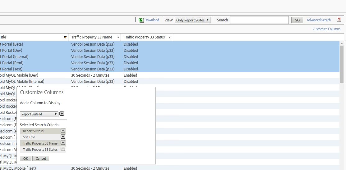 It would be awesome to have the Customize Columns (top right) have List Vars as an option when filtering Report Suites.