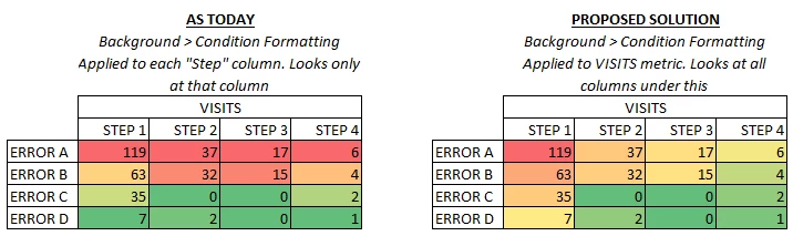 Alternatively, add an option under the conditional formatting to allow it to be added to all columns/cells as a group, or on a column by column basis.