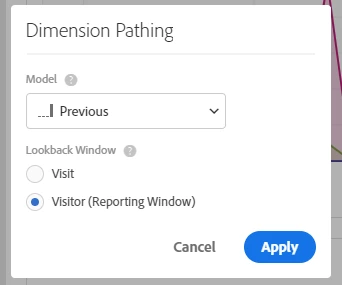 Once opened, we could change the pathing logic like with Metrics. Things we could select there could be items like "Current", "Previous", or "Next". Ideally, we would also have "Entry" and "Exit" in there to clean up the Dimensions list. All would be available for Visit and Visitor levels. It could look like this: