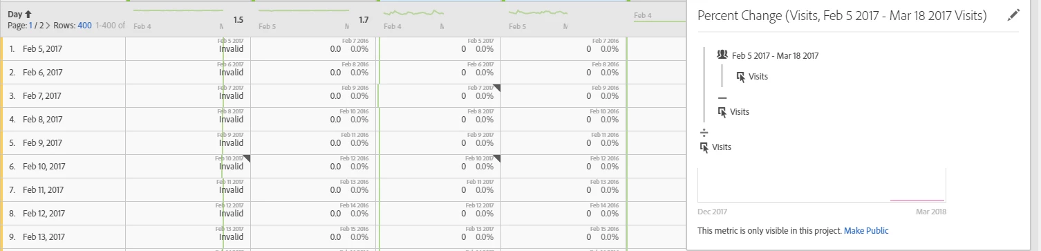 What I actually get, are visits for Feb 4th 2018 vs the entire 6 week date range, and it breaks my workspace by forcing the date range to start at Feb 5th 2017: