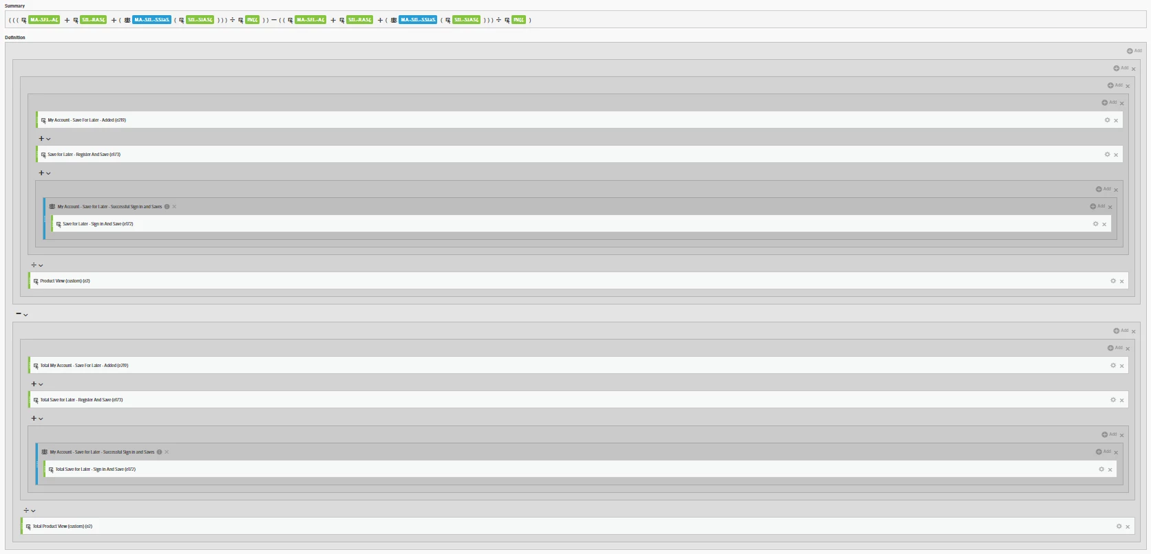 - The UI for the calculated metric builder is not space efficient at all. As soon as your calculated metric definition goes below the fold of your screen, it becomes very hard to manage