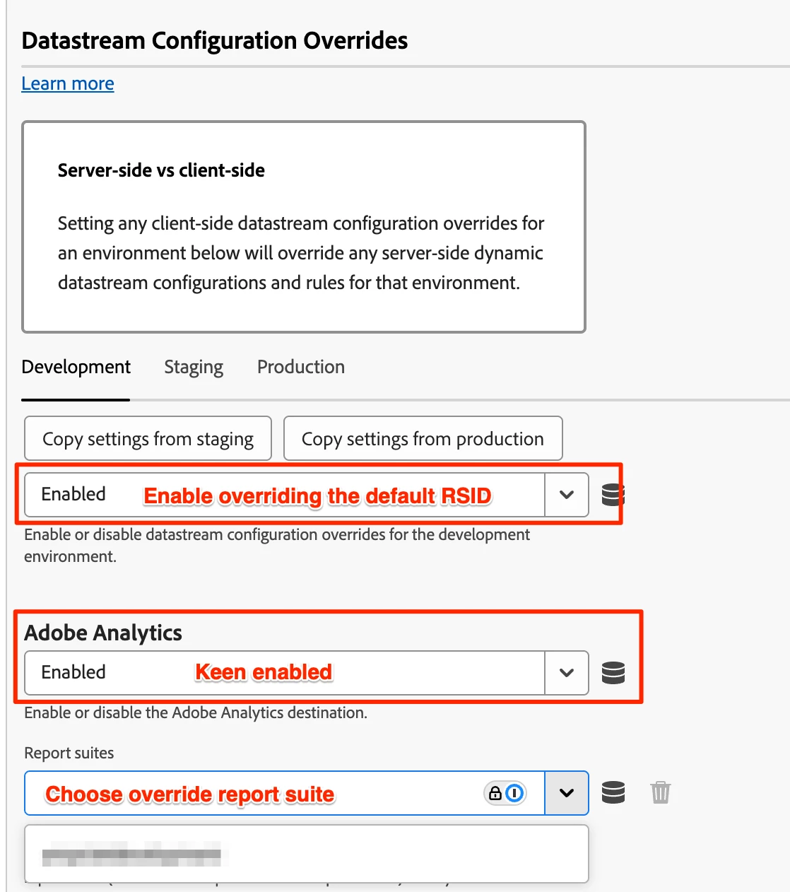 I've got a collection of distinctly separate websites with their own dedicated report suites. The datastream setups however would be identical in every respect other than the report suites the data is going to (all suites on same "account"). I've actually already gone through the steps of copying the datastream repeatedly for each site and environment. Realizing this was going to be a nightmare to manage, I started looking at the overrides as a hopeful alternative.