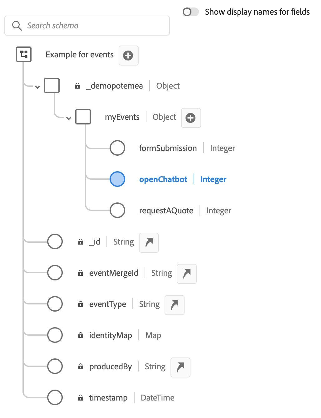 { "_demopotemea": { "myEvents": { "formSubmission": 1, "openChatbot": 1 } }, "eventMergeId": "Sample value", "eventType": "click", "producedBy": "self", "timestamp": "2018-11-12T20:20:39+00:00" }