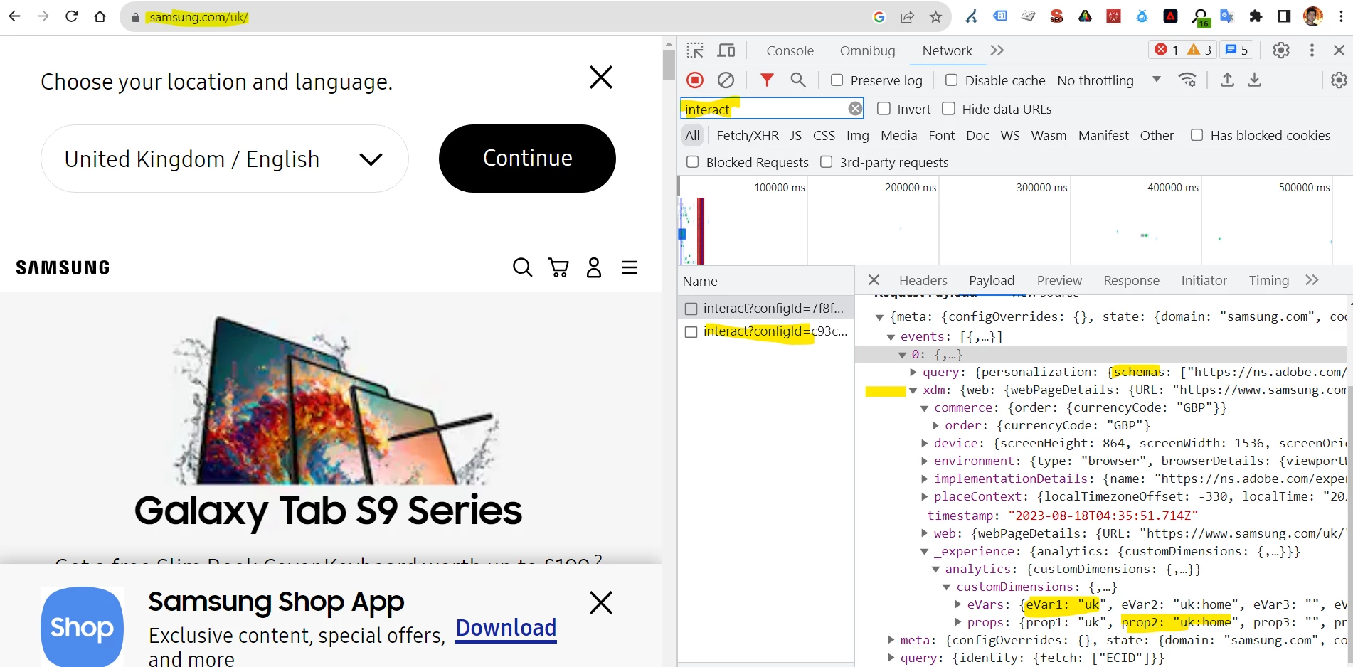 And if we use 'interact' keyword in browser network tab to confirming that website is implemented the Adobe Launch Event forwarding in website.