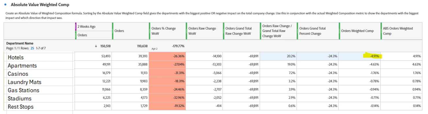 The math below says orders for hotels decreased -14,100 WoW vs all departments -68,891 WoW. As a result the decrease in hotel orders is 20.2% of the total decrease. Given all departments decreased -24.3% WoW, hotels made up -4.91% of the total decrease.
